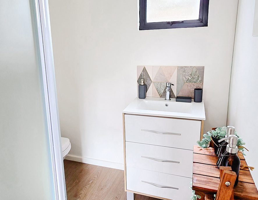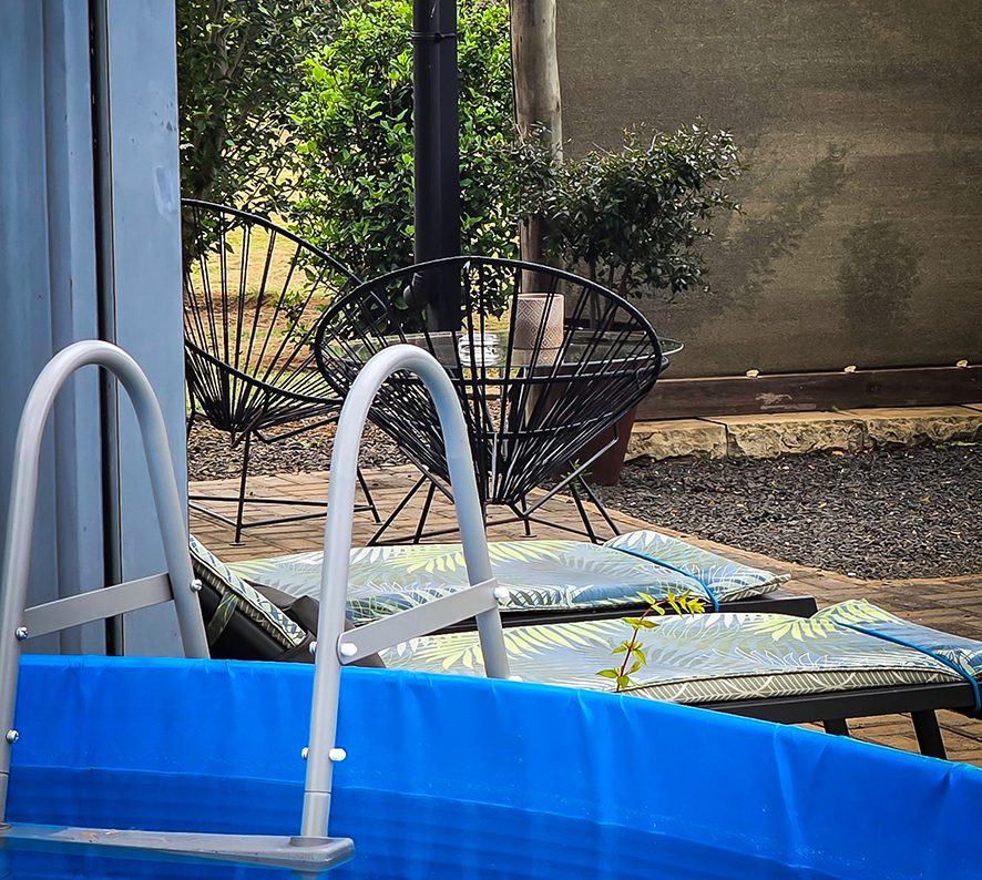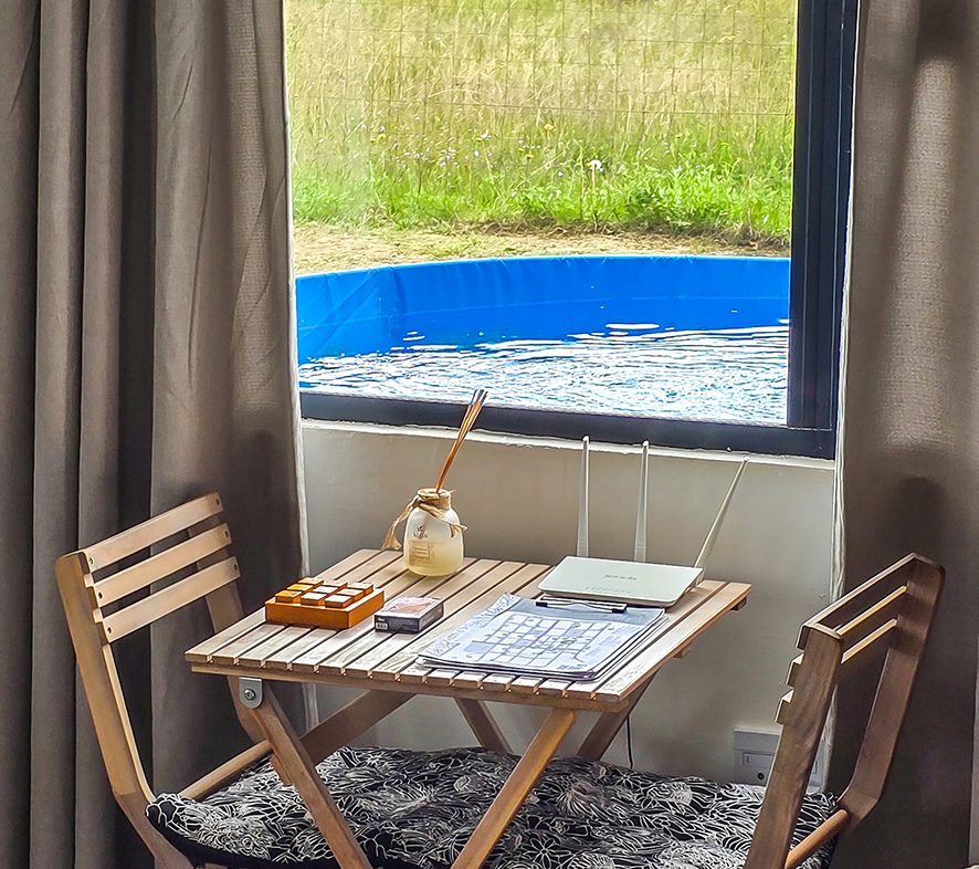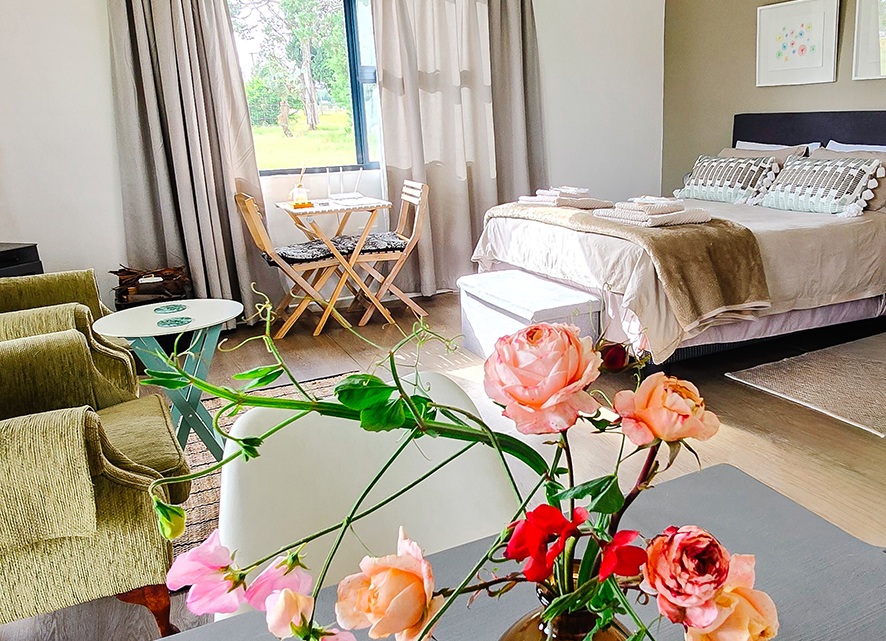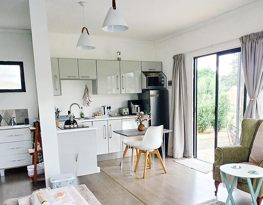 It also boast a fully equipped kitchen for self-catering (including a microwave). Secure parking is available behind locked gates. It also has a very cosy fireplace for the colder nights and a sparkling farm-style splash pool for the warmer days. It has a private braai area and undercover parking.