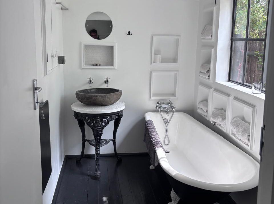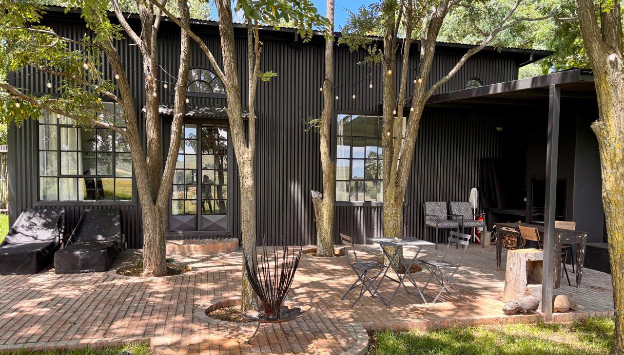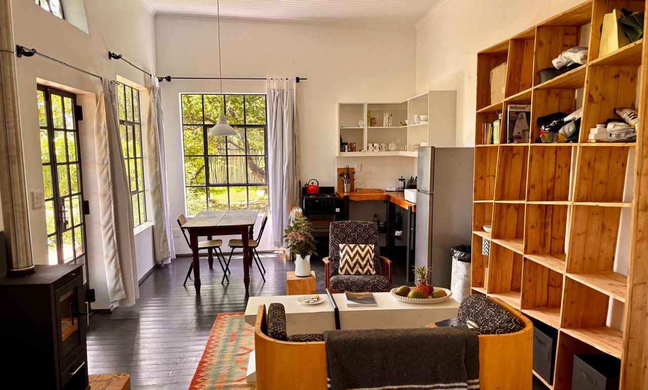 Field Cabin is a tastefully renovated property, tucked away among tall trees, and looking over farm fields on the north side of town. Super private, it is the perfect hideaway spot. Separate driveway entrance and large outdoor living space with brick patio and covered braai area. Beautiful gardens, with mature trees, grass, flower beds, vineyard and a hammock.